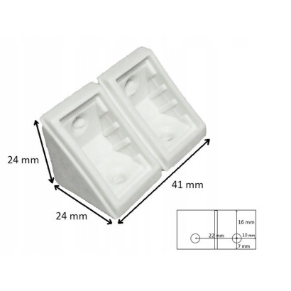 Kątownik podwójny plastikowy z zaślepką. Idealny do łączenia elementów meblowych pod kątem 90°. Stosowany do łączenia płyt, blatów, do wzmacniania konstrukcji stolarskich oraz do mocowania niezbyt ciężkich półek. Bardzo prosty w montażu.
