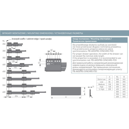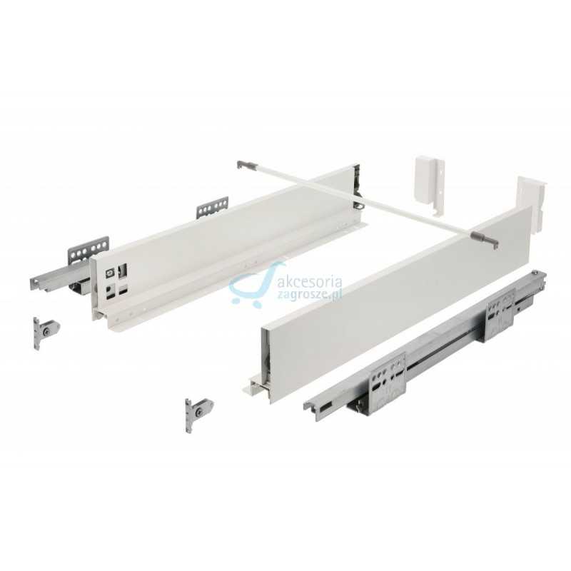 Szuflada AXIS PRO Push to open zapewnia pełny wysuw w długościach od 300 do 550 mm, a mechanizm push to open z synchronizacją (na osobnej aukcji) otwarcia gwarantuje płynne otwieranie szuflady, poprzez nacisk na dowolne miejsce frontu szuflady. 5 wariantów wysokości sprawi, że idealnie dopasujesz ją do swojej kuchni, a bok szuflady o szerokości tylko 13 mm umożliwia maksymalne wykorzystanie wewnętrznej przestrzeni szuflady. Obciążenie szuflady pozwala na umieszczenie w niej aż 40 kg różnych produktów. Montaż szuflady jest łatwy dzięki komfortowej regulacji od wewnętrznej strony szuflady, regulacji pochylenia oraz regulacji poziomej w zakresie +- 2 mm.